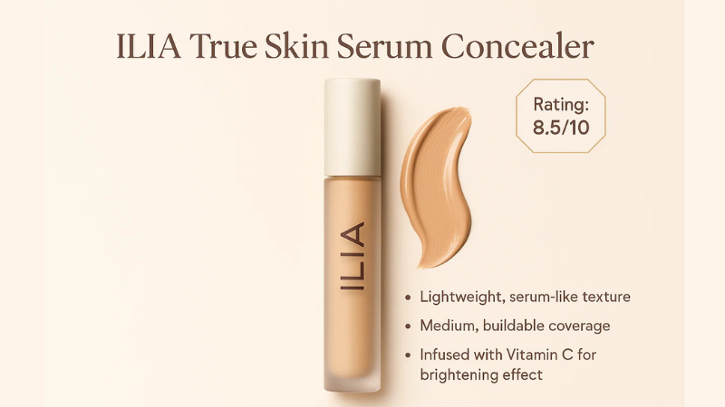- Medium: Maybelline Instant Age Rewind Eraser Dark Circles Treatment Multi-Use Concealer, ILIA – True Skin Serum Concealer.
