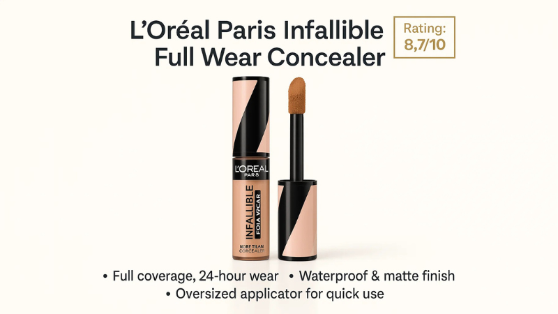 - Oily Skin: L’Oreal Paris Makeup Infallible Full Wear Waterproof Matte Concealer, tarte shape tape full-coverage concealer.